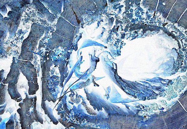 Artistically remastered photograph of an old tree stump and undergrowth in the Grampians National Park, in a beautiful pattern with ice blue, blue and grey tones.
